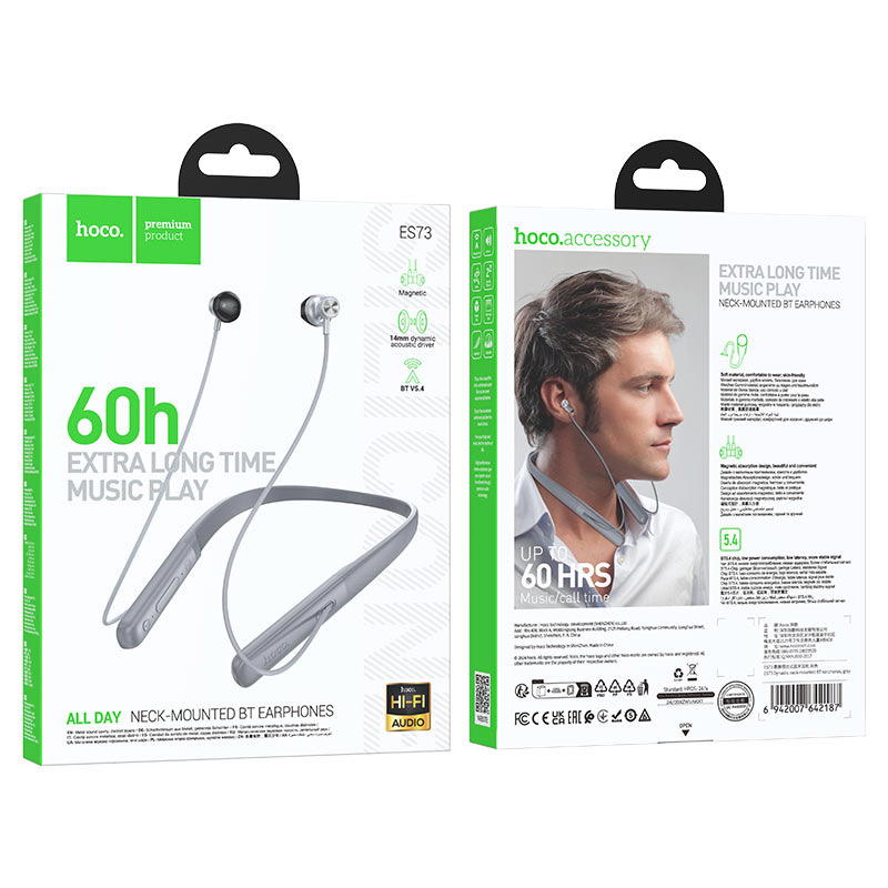 سماعات أذن لاسلكية (بلوتوث) تثبت حول الرقبة من hoco. (موديل ES73)، مصممة خصيصًا لتوفير وقت تشغيل طويل للغاية للموسيقى.